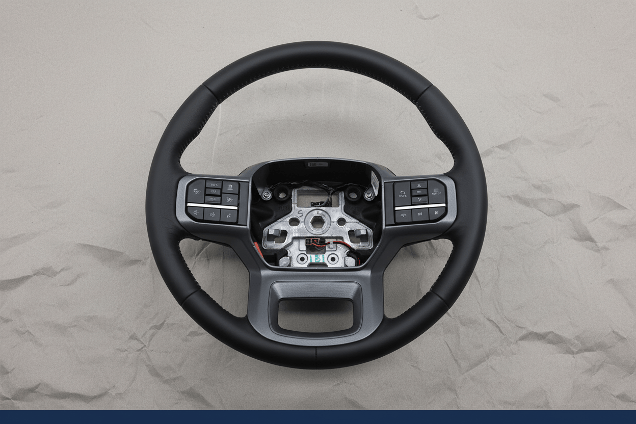 This is a Genuine OEM black leather heated steering wheel, the exact same part sold at your new car dealership. Designed specifically for 2023-2025 Ford F-250, F-350, F-450, and F-550 Super Duty Lariat models, this premium steering wheel features integrated heating, lane departure warning, and adaptive cruise control functionality for enhanced comfort and safety.